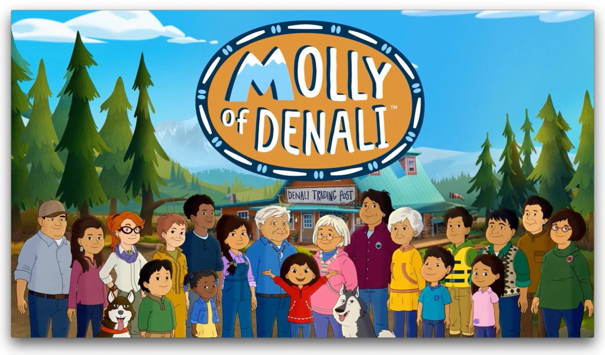 Molly of Denali is an animated television series for kids ages 4-8 that features the story of Molly Mabray, a gregarious 10-year-old girl who runs the Denali Trading Post with her parents in the village of Qyah (which means “community” in the Dena’ina Athabascan language). With her dog Suki and best friends Tooey and Trini, Molly adventures through picturesque Alaska on dogsled, snowshoe, ATV, bush plane, canoe, and foot. Along the way, she solves problems using knowledge from her Elders, as well as books, maps, apps, and other informational texts. Through her vlog, she shares knowledge about herself, her adventures, and Alaska Native values, such as honoring your Elders, knowing who you are, and sharing what you have.