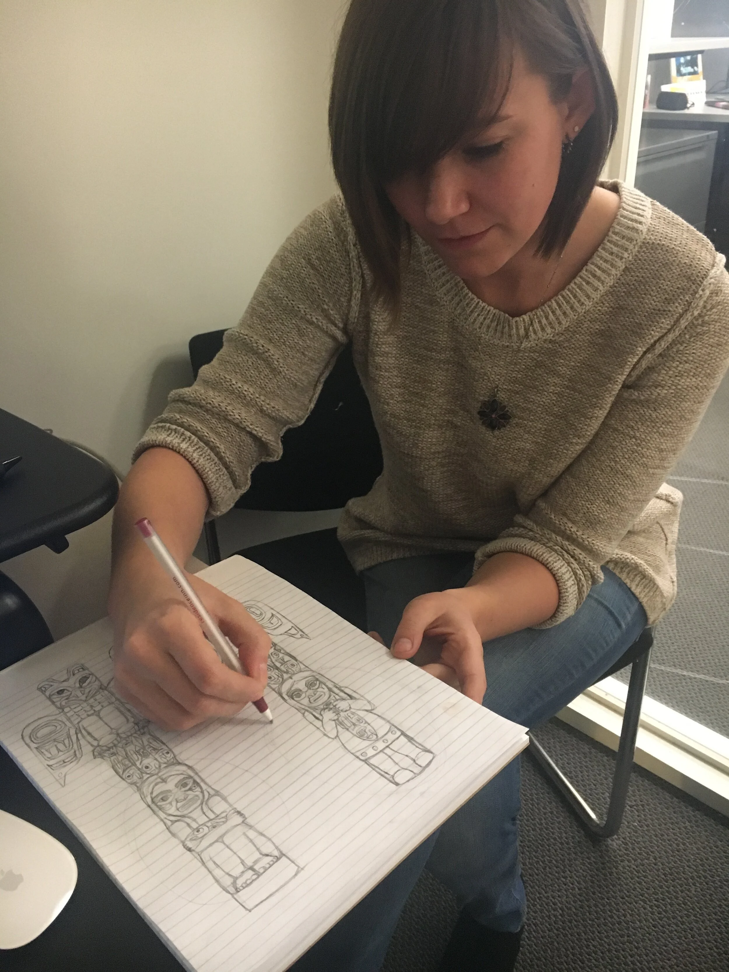 The first is about a story we did around totem poles. In “Tale of a Totem,” Molly heads down to Sitka in southeast Alaska to visit her cousin and attend her first totem pole raising. It was a story idea we had passed on earlier that I suggested we revisit after hiring our production assistant Sydney Isaacs. A Tlingit Alaska Native, Sydney is a talented artist and an apprentice totem pole carver who studied under a master carver in her hometown of Klawock, Alaska. She served as this script’s cultural advisor, reviewing every draft. She educated us about the different purposes of totem poles, how some were created to preserve the stories of the Tlingit through the ages. She steered our well-meaning script writers away from using a sacred story belonging to a group of Haida people that the authors had found on their own. And when the time came to animate the episode, she designed the totem pole Randall and his community raised with the blessing of her master carver, gifting the series with a special story of its own.