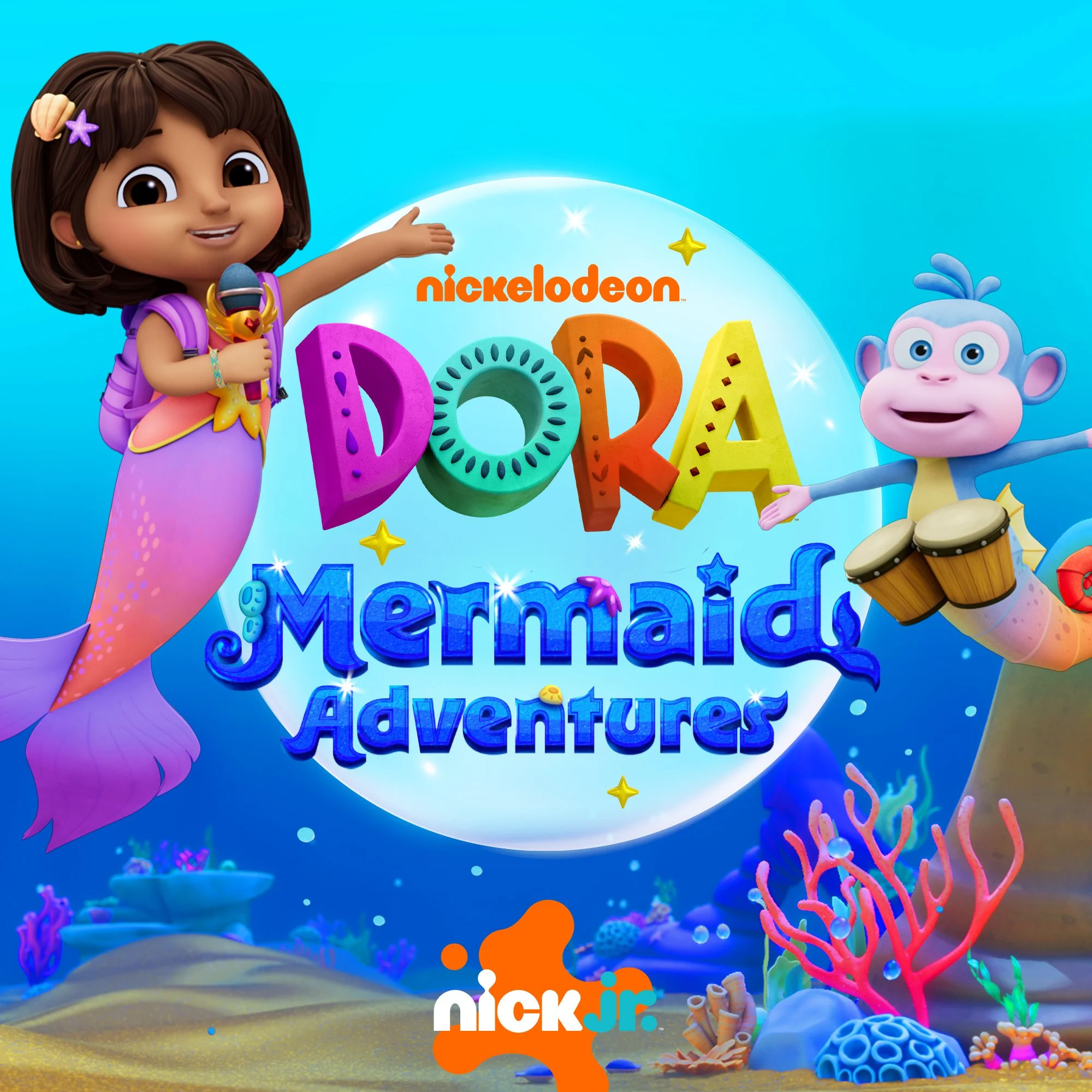 At the beginning of each episode, Dora and Boots transform into mermaids by strumming their magical charango. They then join their bandmates Rosa, a cheerful pink dolphin, and Marisol, a mermaid with magical items. Together, they form the band Todos Juntos, and encourage kids to sing, clap, and dance along to their music! Dora teaches Spanish words to the listeners, and when they repeat it back, it helps Dora and her friends save the sea creatures and defeat Octo-Swiper!